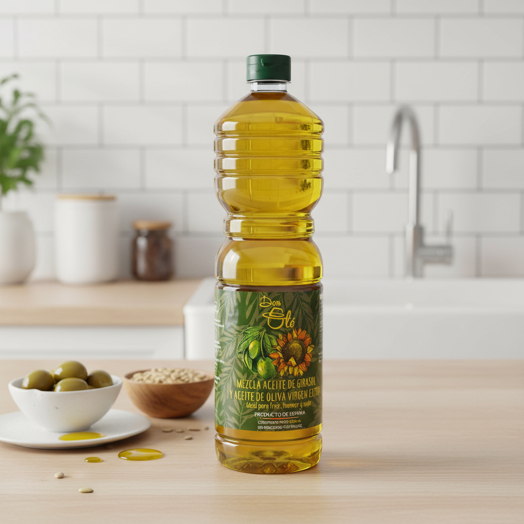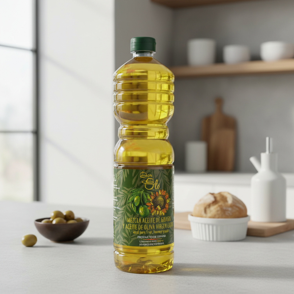 Mezcla Don Olé 80% Girasol + 20% Aceite de Oliva Virgen Extra – 1 Litro Sabor equilibrado, ideal para freír, saltear y aliñar. Combina la ligereza del girasol con el toque aromático y saludable del oliva virgen extra. ¡Rinde más y cuida tu cocina diaria!