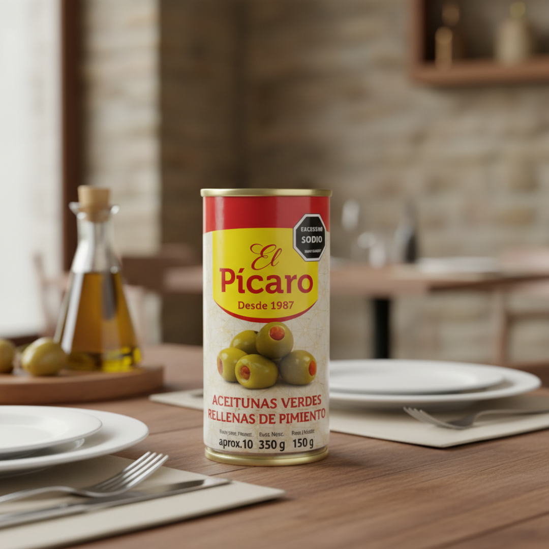 Disfruta de las aceitunas rellenas de Pimiento el PICARO en presentación de 350gr, perfectas para aperitivos y tapas con un sabor genuino.